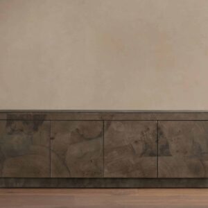 We've had this polanco media console for a few months now and it holds up great. It easily supports our heavy vintage audio equipment. I love the reeded glass detail – it lets remote signals through but hides the clutter inside.