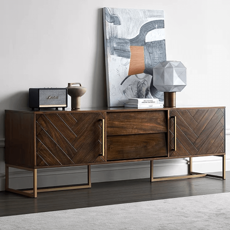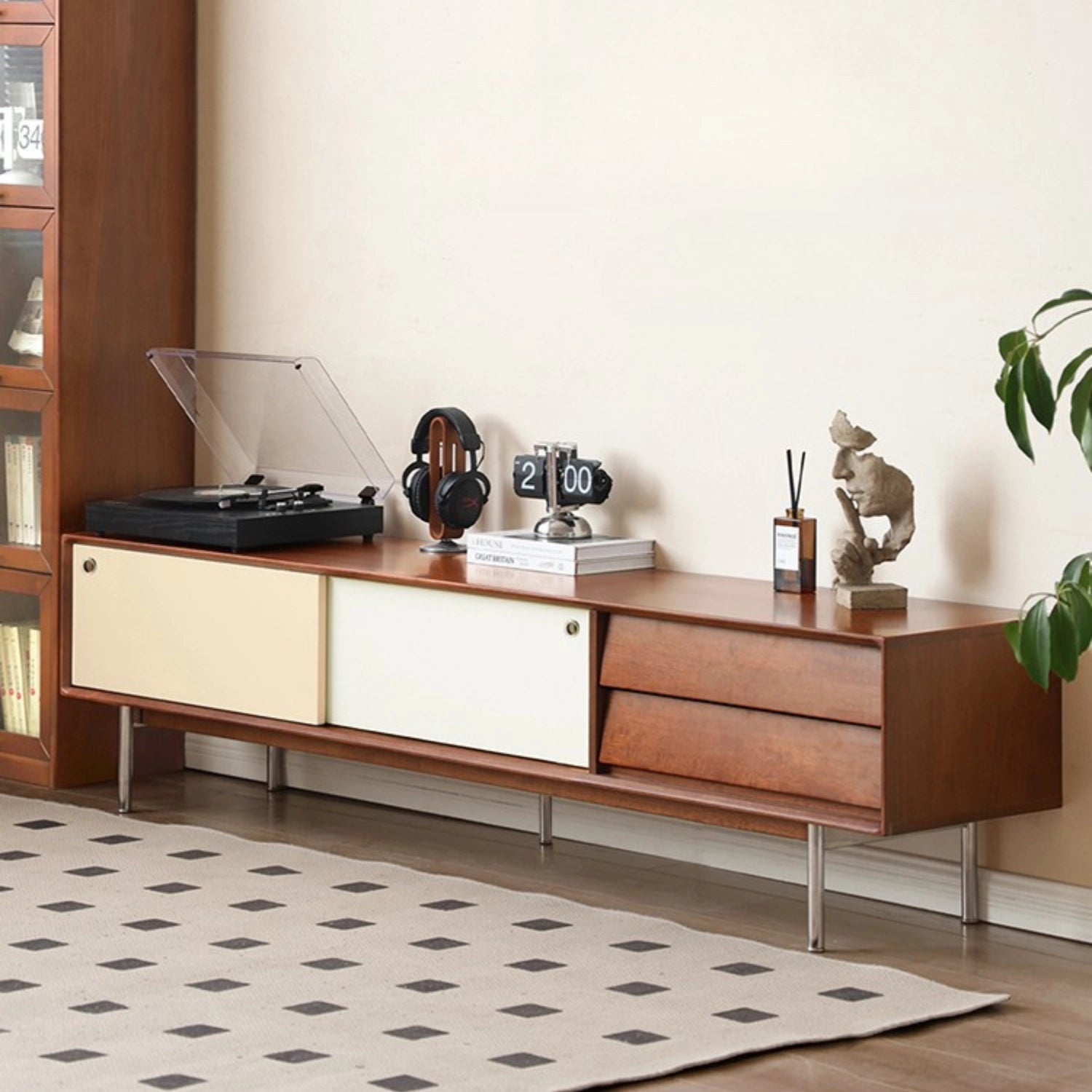 Mid century Modern Wood TV Stand with 2 Drawers. Sliding Doors and Metal Legs