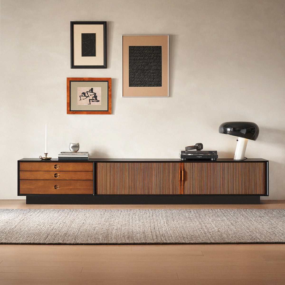Low Profile Tambour Door TV Stand. Brown & Black Boxwood Media Console for TVs Up to 85