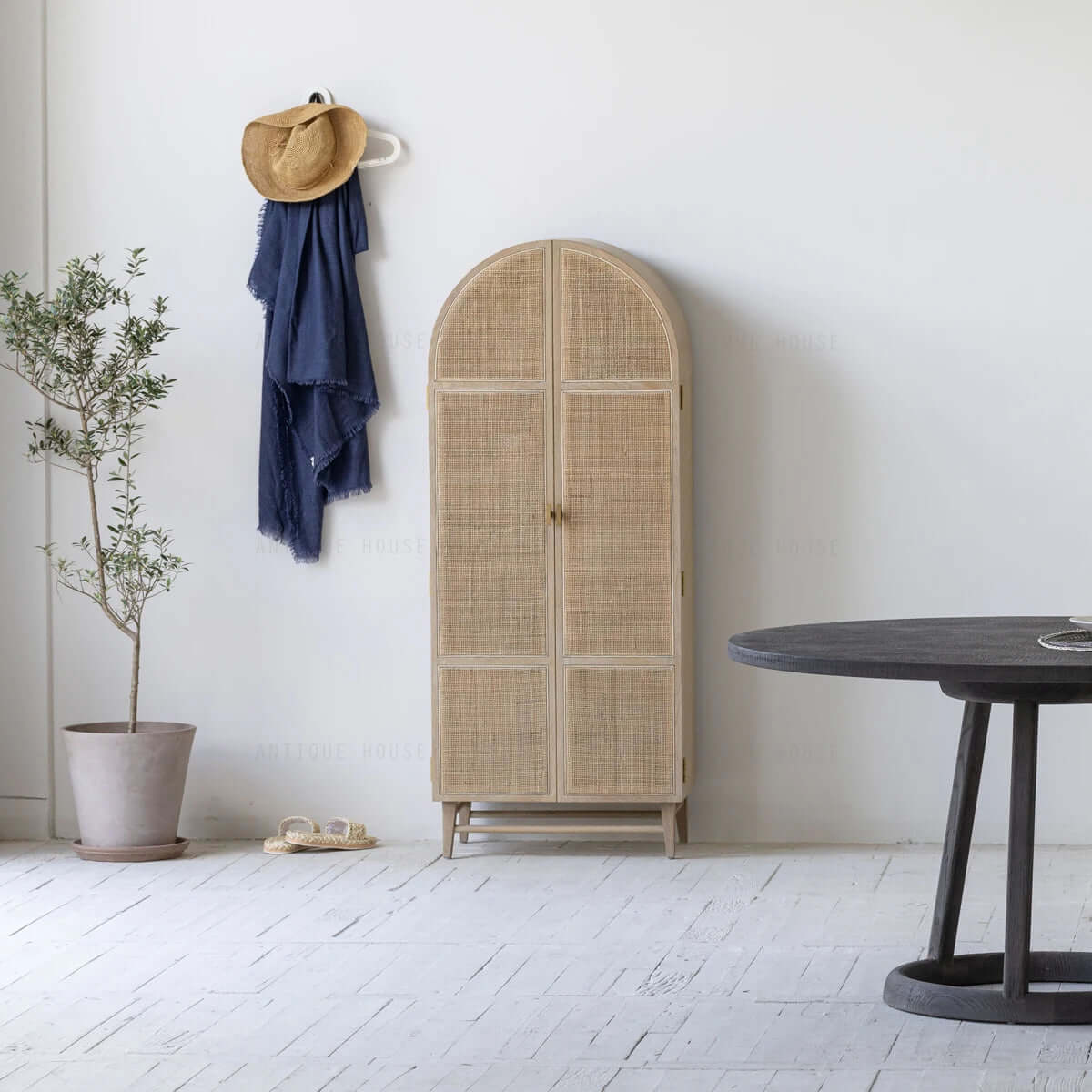 The Kara Wood Cabinet blends rustic charm with sophisticated design. Crafted from wood and rattan, it features ample storage behind an arched frame. A statement piece for any room.